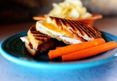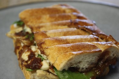Итальянский бутерброд панини с обжаренным на гриле куриным филе, голубым сыром, зеленью и инжирным джемом.