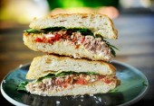 Вкуснейшие бутерброды с котлетами из говяжьего фарша с луком, сыром фета, вялеными помидорами и специями, а также вашим любимым топпингом и греческим соусом дзадзики.