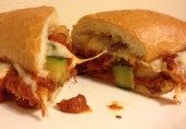 Булочки с курицей, обжаренной на гриле, соусом маринара, моцареллой, пармезаном и свежим базиликом.