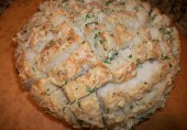 Хлеб, разрезанный на ломтики и нашпигованный маслом с зеленью и чесноком и тертым пармезаном и запеченный в духовке.