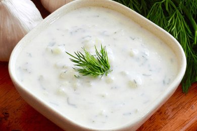 Традиционное блюдо греческой кухни - холодный чесночный соус с тертым огурцом, медом, мятой и майонезом.