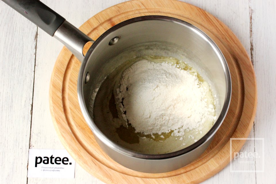 Размешиваем муку и масло, слегка обжариваем до золотистого цвета. Очень удобно использовать силиконовую лопатку, так как она отлично проходит по стыку дна и бортиков посуды, соответственно, ничего не подгорает и масса готовится равномерно. Обжаренная в масле мука называется ру.