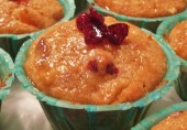 Мини-кексы с абрикосовым джемом, творогом, курагой, сушеной клюквой и яблоками, покрытые глазурью из меда с абрикосовым джемом и лимонным соком.