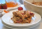 Сладкий пирог из овсяных хлопьев с цельнозерновой мукой, апельсиновым соком, йогуртом и корицей, с начинкой из абрикосового джема с клубникой, посыпанный рубленым жареным пеканом.