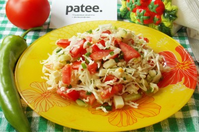 Салат с сыром и овощами, отличная альтернатива “Греческому”. Хрустящие сухарики придают особую пикантность, слегка пропитываясь маслом и соками овощей.