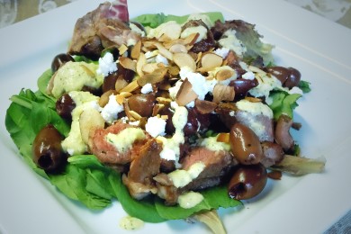 Салат из жареной на гриле баранины с зеленью, оливками, миндалем, сыром фета и соусом айоли из манго и майонеза.