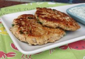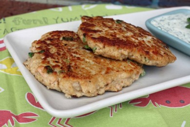 Котлеты из филе лосося с чесноком, лимоном и сухарями, приготовленные на оливковом масле. Подавайте с соусом айоли из йогурта с майонезом, кинзой и лимонным соком.