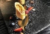 Хрустящие и сладкие груши, запеченные в духовке и замаринованные в красном десертном вине с корицей, сычуаньским перцем, сушеными вишнями и плодами звездчатого аниса.