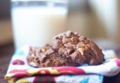 Печенье из шоколадного теста с арахисовым маслом, шоколадными чипсами и арахисом, посыпанное крупной солью.