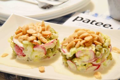Свежий хрустящий летний салат с огурцами, редисом, грушей, жареным арахисом, имбирем, рисовым уксусом и мирином.