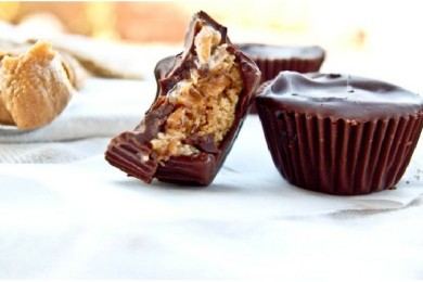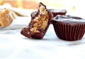 Кексы из фиников, орехов и овсяных хлопьев, с начинкой из арахисового масла, покрытые шоколадом.