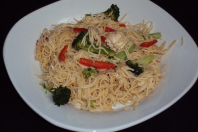 Спагетти с арахисовым соусом, морковью, сладким перцем, луком, зеленью и жареным кунжутом. Можно добавить в спагетти немного жареного куриного филе, креветки или тофу.