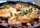 Куриные грудки, обжаренные в масле и доведенные до готовности в соусе из красного вина с грибами, артишоками, чесноком и тимьяном.