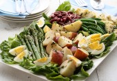 Легкий салат из картофеля со спаржей, фасолью, артишоками, яйцами и латуком.