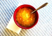 Суп из куриного бульона с сладким картофелем, сушеным базиликом и чесночным порошком.