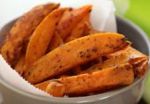 Нарезать батат и перемешать с оливковым маслом и специями. Запекать 30 мин при 200 градусах