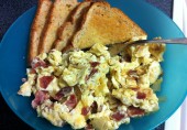 Яичница из двух яиц и шести яичных белков с обжаренным беконом и луком.