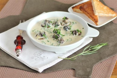 Куриные окорочка, обжаренные на масле и приготовленные в соусе из бульона с бренди, белым вином и чесночной пастой.