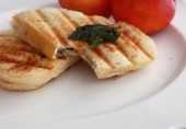 Сэндвич с сыром, ломтиками ветчины, нектарина (или персика) и листьями базилика, обжаренный на гриле.