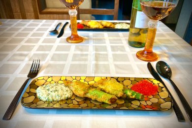 Профитроли из цветков цукини с крабами в соусе Бри