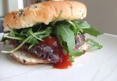 Бургер с черной фасолью, овсяными хлопьями и беконом, приправленный вустерским соусом. Подавать в булочке для бургеров с кетчупом, майонезом и рукколой.