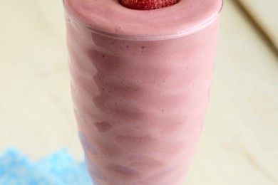 Вкуснейший прохладительный напиток из клубники, банана и молока с ванилином. Если хотите, можете добавить немного стевии или другого заменителя сахара.