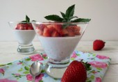 Сладкий мусс из кокосовых сливок с клубникой, покрытый подслащенной свежей клубникой.
