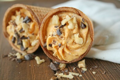 Вафельные рожки, заполненные кремом из взбитых сливок с тыквенным пюре, сыром рикотта и специями и посыпанные орехами и шоколадом.
