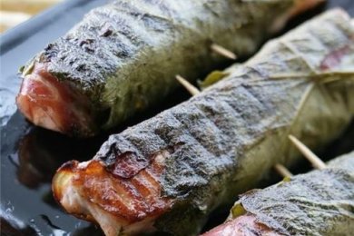 На гриле, или под грилем в духовке, или на сковороде-гриль… Интересное сочетание нежной, сладковатой рыбы и терпких листиков.