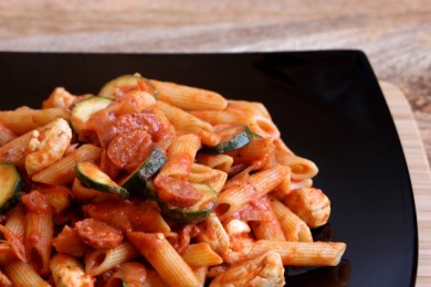 Паста с куриным филе и колбасой, обжаренными в масле и тушенными в томатном соусе со сливками и специями.
