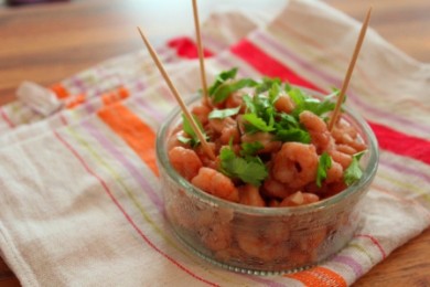 Креветки, покрытые специями, жаренные на сковороде и политые соусом из лимонного сока с белым вином.