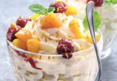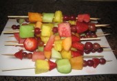 Нанизайте нарезанные фрукты на шпажки в произвольном порядке, приготовьте сливочный соус и подавайте к новогоднему столу.
