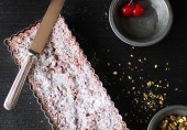 Простой и вкусный открытый пирог из песочного теста с начинкой с консервированной вишней и фисташками.