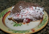 Шоколадный пирог со сливочно-вишневой начинкой, посыпанный тертым шоколадом.