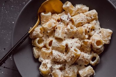 Вкусный салат из пасты с виноградными помидорками, сыром гауда и сыром чипотле, заправленный сливочным соусом.