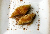 Пахлава из теста фило со спредом Бискофф и дробленым печеньем с пряностями, пропитанная сиропом из агавы.