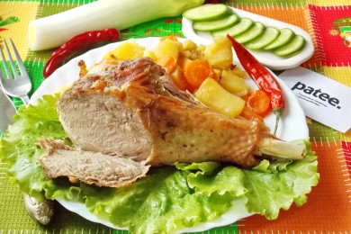 Решила поэкспериментировать с любимым мясом по французски, только за основу взяла не свинину, а диетическую голень индейки, эксперимент удался на славу, вся семья в восторге, мясо получилось нежным и сочным!