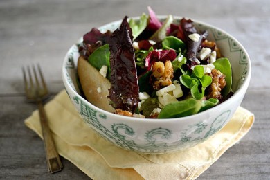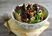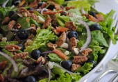 Салат из латука с жареным беконом, сыром горгондзола, свежей черникой и засахаренным пеканом.