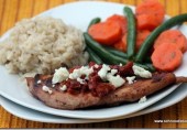 Куриное филе, маринованное в бальзамическом уксусе с чесноком, горчицей, медом и лимонным соком и обжаренное на гриле, с сыром горгондзола и вялеными помидорами.