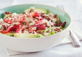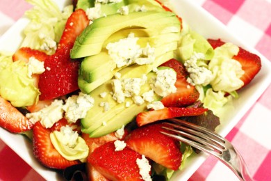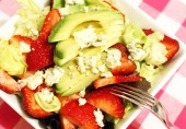 Салат из свежей клубники с авокадо, курицей, беконом и салатной зеленью, посыпанный сыром горгондзола и пеканом.