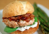 Сэндвичи с котлетами из куриного фарша и розмарина, свежей рукколой и карамелизованным луком.