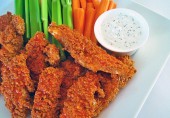 Куриное филе, маринованное в пахте с чесночным и острым соусом и уксусом, покрытое смесью сухарей с мукой и специями и запеченное в духовке.