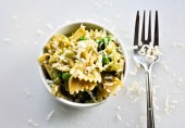 Паста фарфалле с тушеными грибами, луком, артишоками и горошком под соусом песто и сливками.