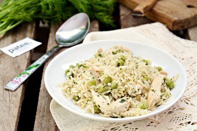 Рис басмати сам по себе в готовом виде рассыпчатый и очень вкусный! Благодаря куркуме он приобретает ещё и аппетитный золотистый цвет, а со свиным фаршем и зелёным горошком такой рис превращается в отличное второе блюдо!