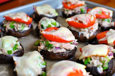 Шляпки грибов портобелло с начинкой из консервированного тунца с сладким перцем, халапеньо, дижонской горчицей, майонезом, помидорами и сыром.