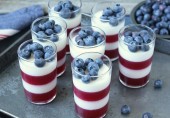 Легкая, освежающая панна котта с малиновым желе, украшенная ягодами черники.