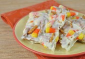 Отличное сладко-соленое угощение на Хэллоуин! Это смесь белого шоколада с ирисками и крендельками. Очень вкусно!