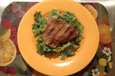 Тунец Ахи, обжаренный с каджунской приправой, и салат-латук, приправленный соусом Цезарь с кинзой. Вкусно и полезно!