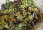 Салат из листьев капусты кале с тертым сыром, чесноком и сухарями, заправленный оливковым маслом и лимонным соком.