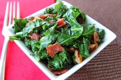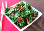 Капуста кале, приготовленная на жиру бекона и бальзамическом уксусе, с жареным беконом и специями.